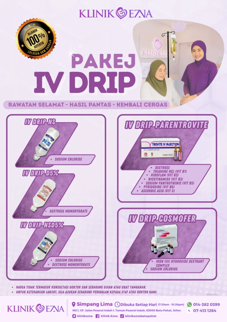 Klinik Ezna menawarkan IV Drip Therapy di Batu Pahat untuk membantu menambah hidrasi, merawat letih & lesu badan, melegakan muntah dan cirit-birit, meredakan migrain serta sakit kepala. Rawatan IV Drip ini juga membantu meningkatkan imuniti, tenaga, stamina, kualiti kulit, menambah darah dalam badan dan sesuai untuk kesihatan ibu mengandung. Pilihan IV Drip termasuk NS, D5, NSD5%, Parenterovite dan Cosmofer. Semuanya dijamin 100% autentik dan lulus KKM.