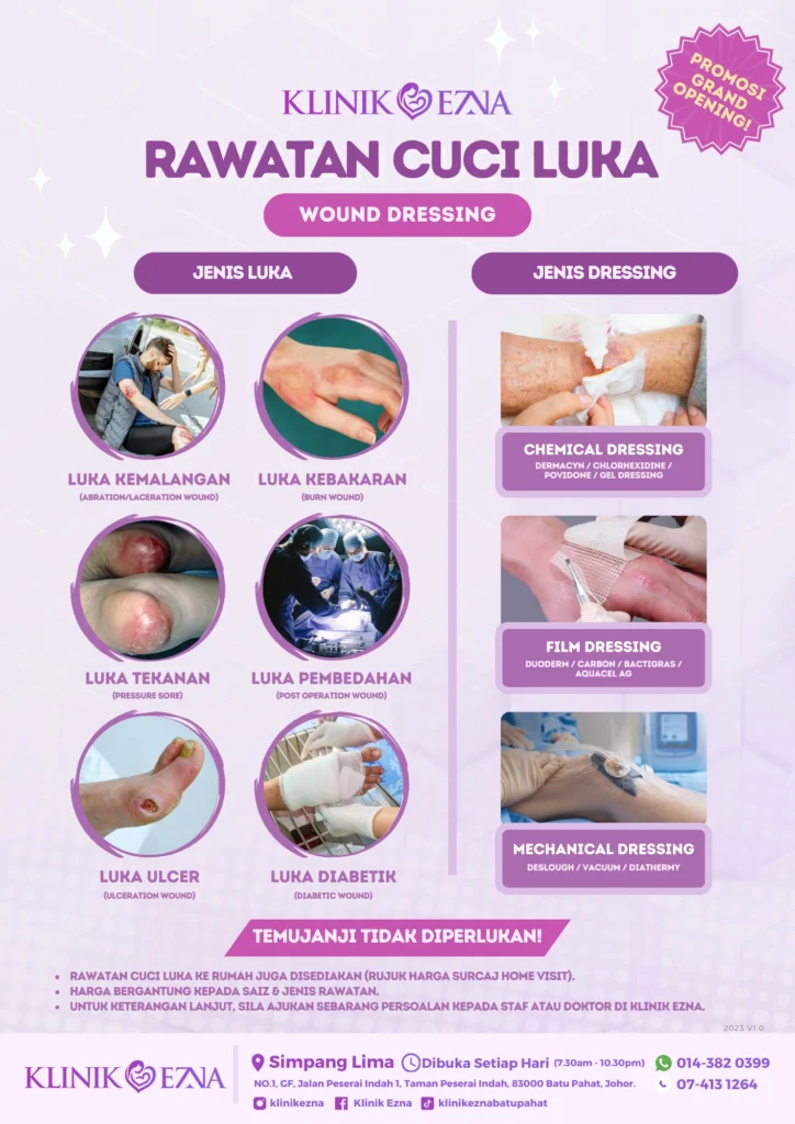 Klinik Ezna menyediakan Rawatan Cuci Luka untuk pelbagai jenis luka seperti luka kemalangan, luka kebakaran, luka tekanan, luka pembedahan, luka ulser dan luka diabetik. Terdapat pilihan dressing seperti chemical dressing, film dressing dan mechanical dressing mengikut jenis luka. Temujanji tidak diperlukan dan rawatan cuci luka ke rumah turut disediakan.